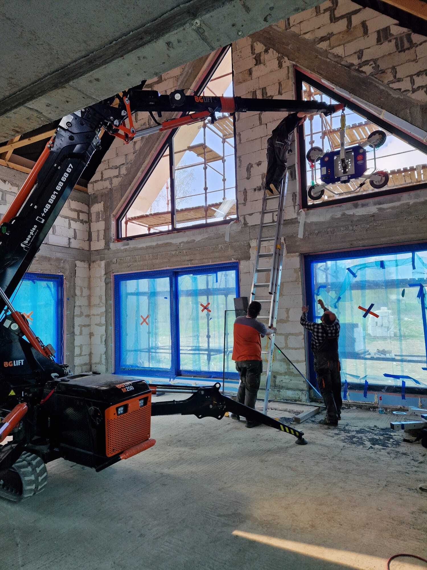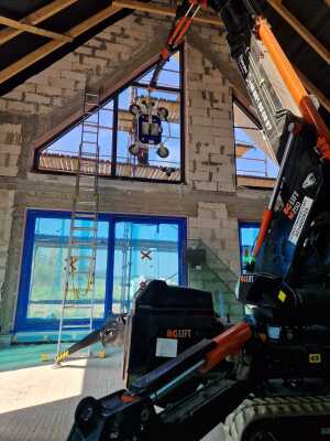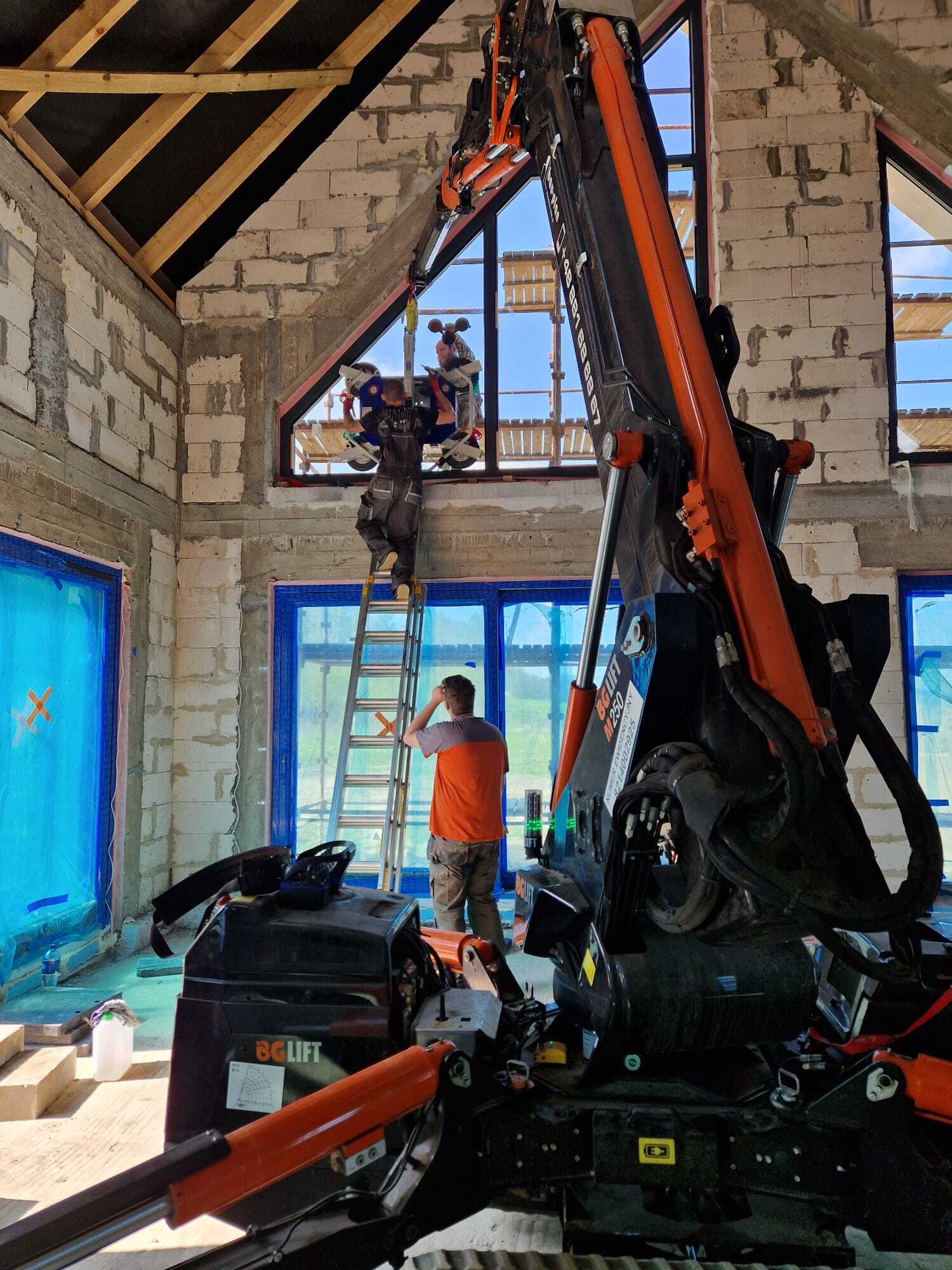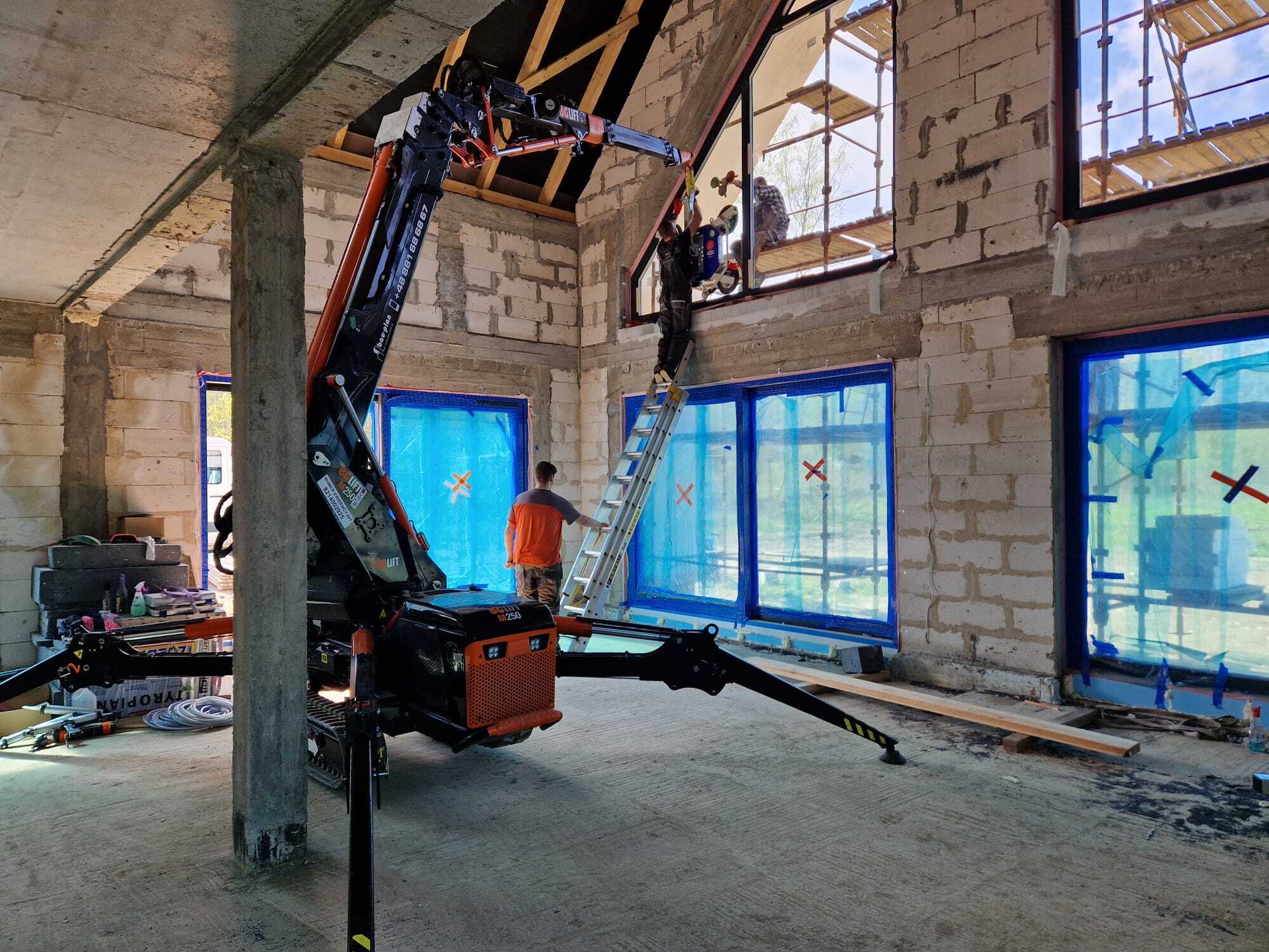 Die Verglasung der Fenster mithilfe Minikran BG Lift M250 in Anusin.