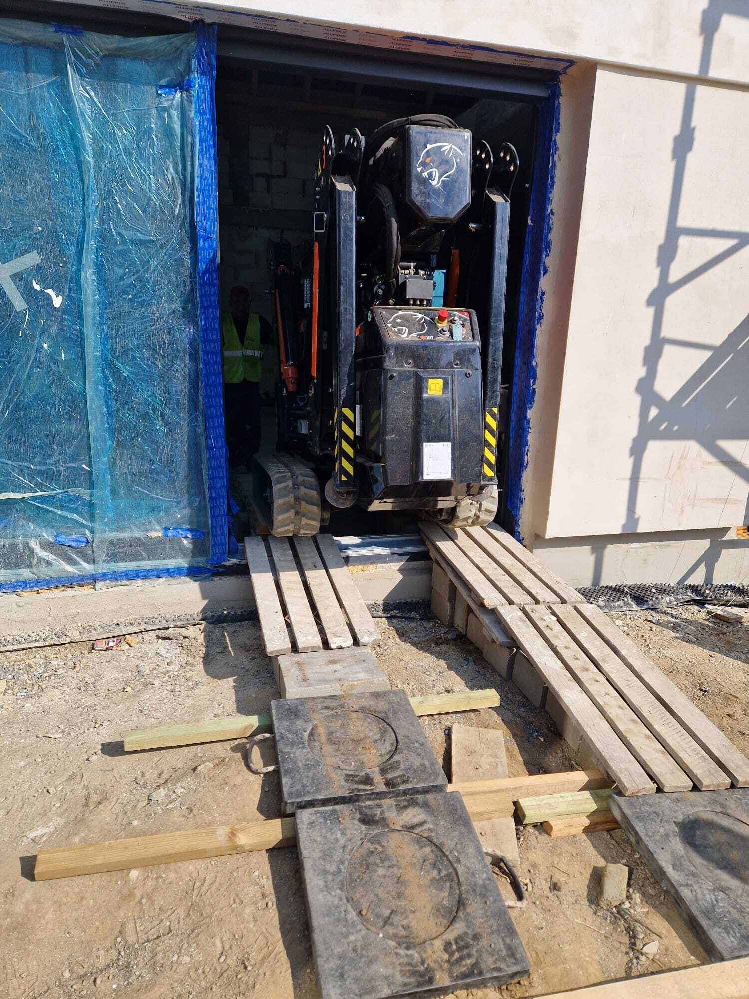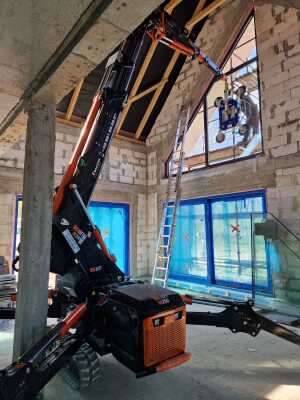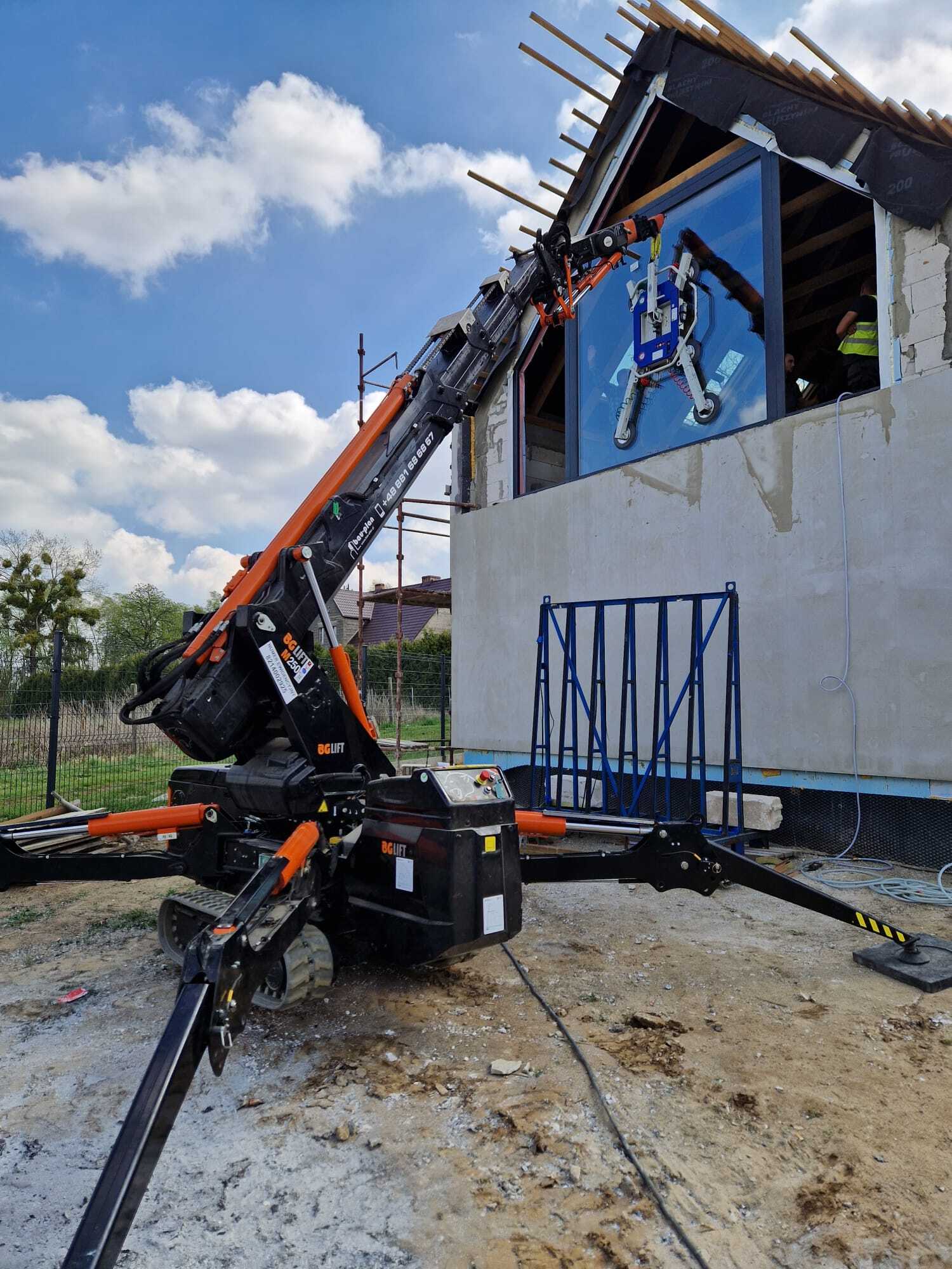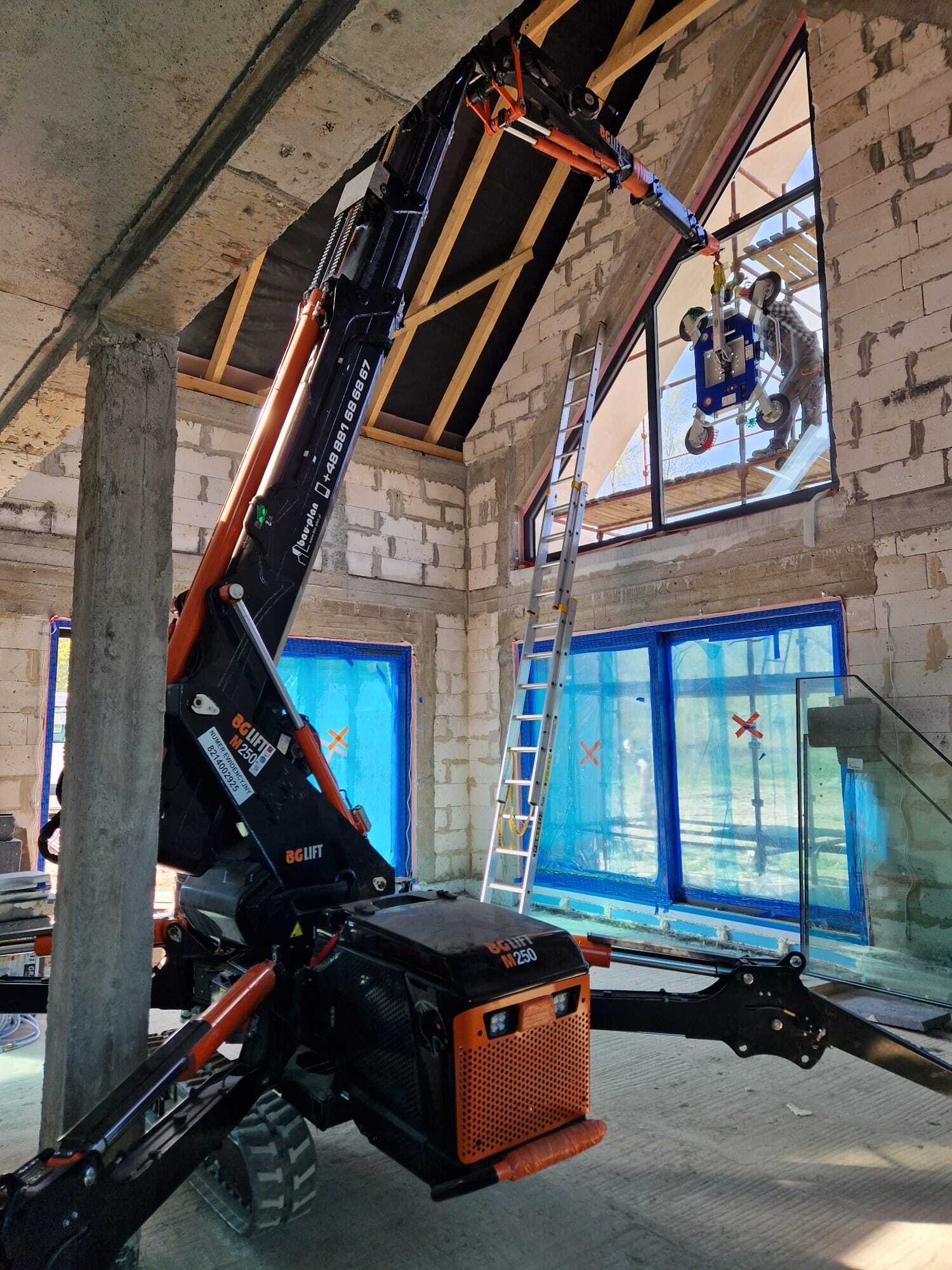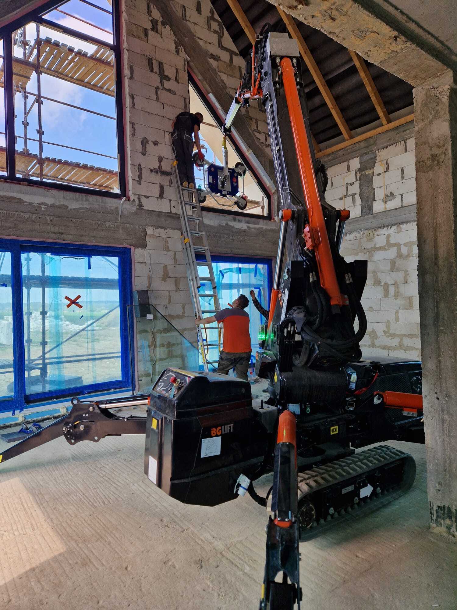 Die Verglasung der Fenster mithilfe Minikran BG Lift M250 in Anusin.