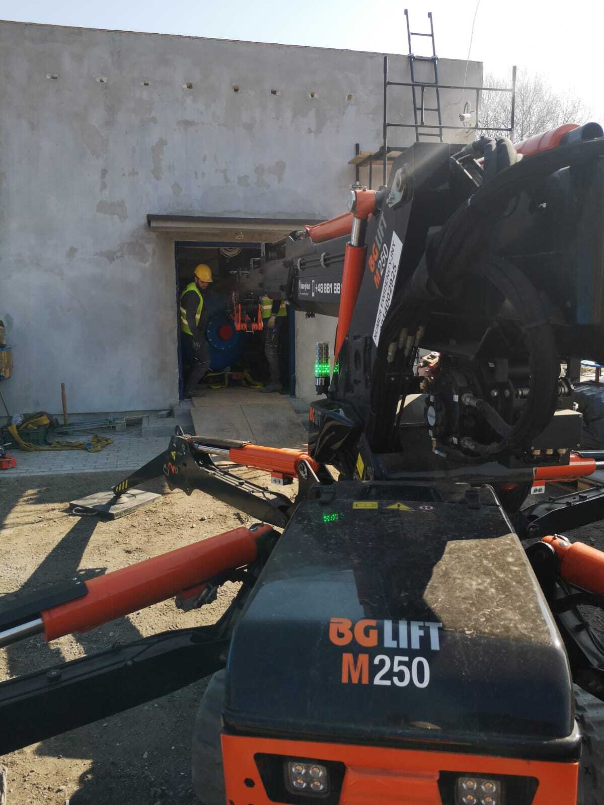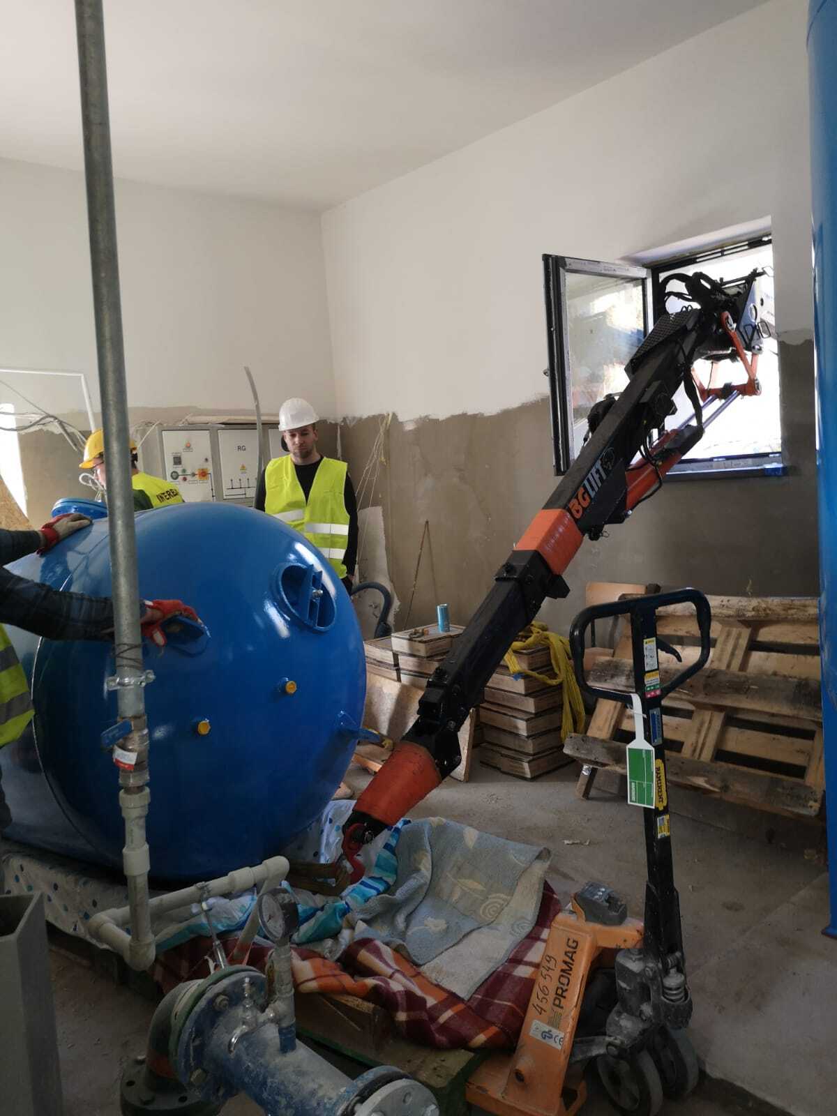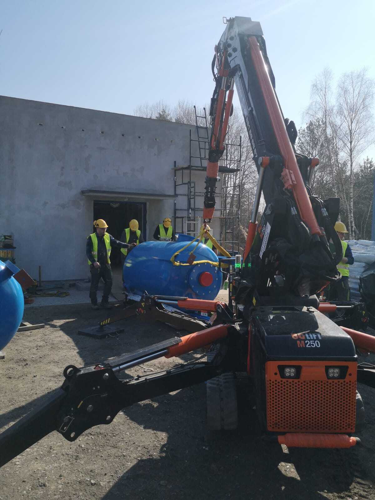 Montage von Behältern mit dem Minikran BG Lift M250 im Rahmen der Modernisierung und des Austauschs der technologischen Systeme in der Wasseraufbereitungsanlage (SUW) in Chrośna.