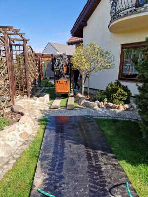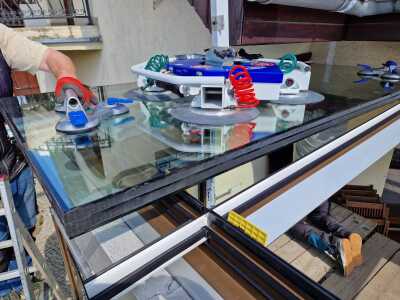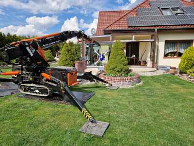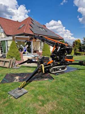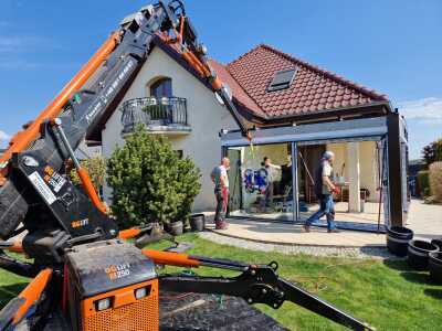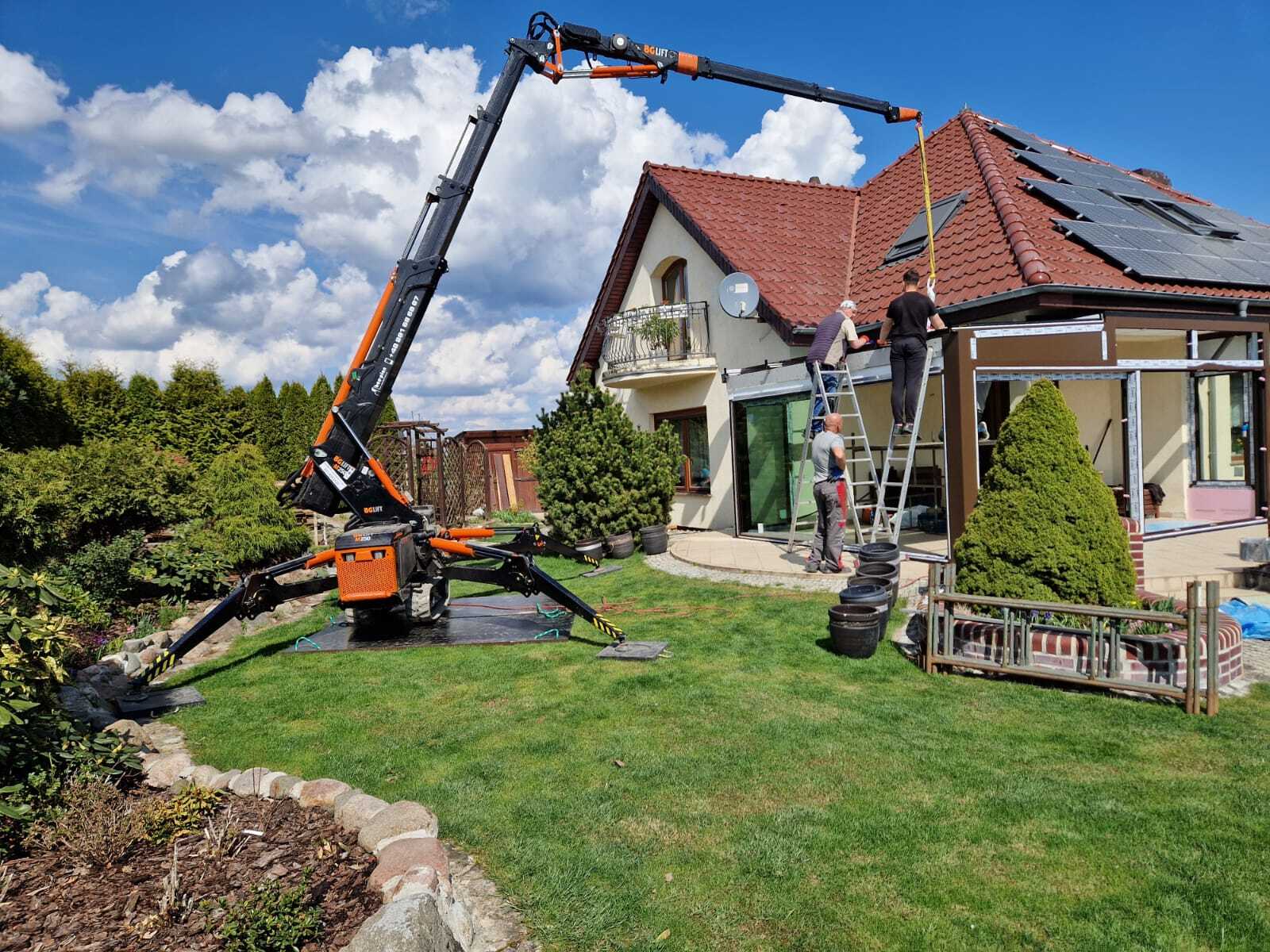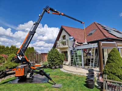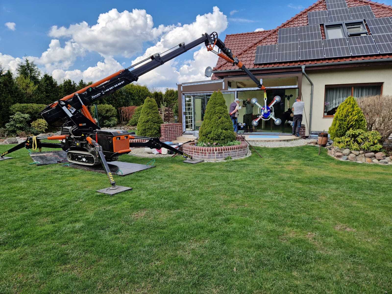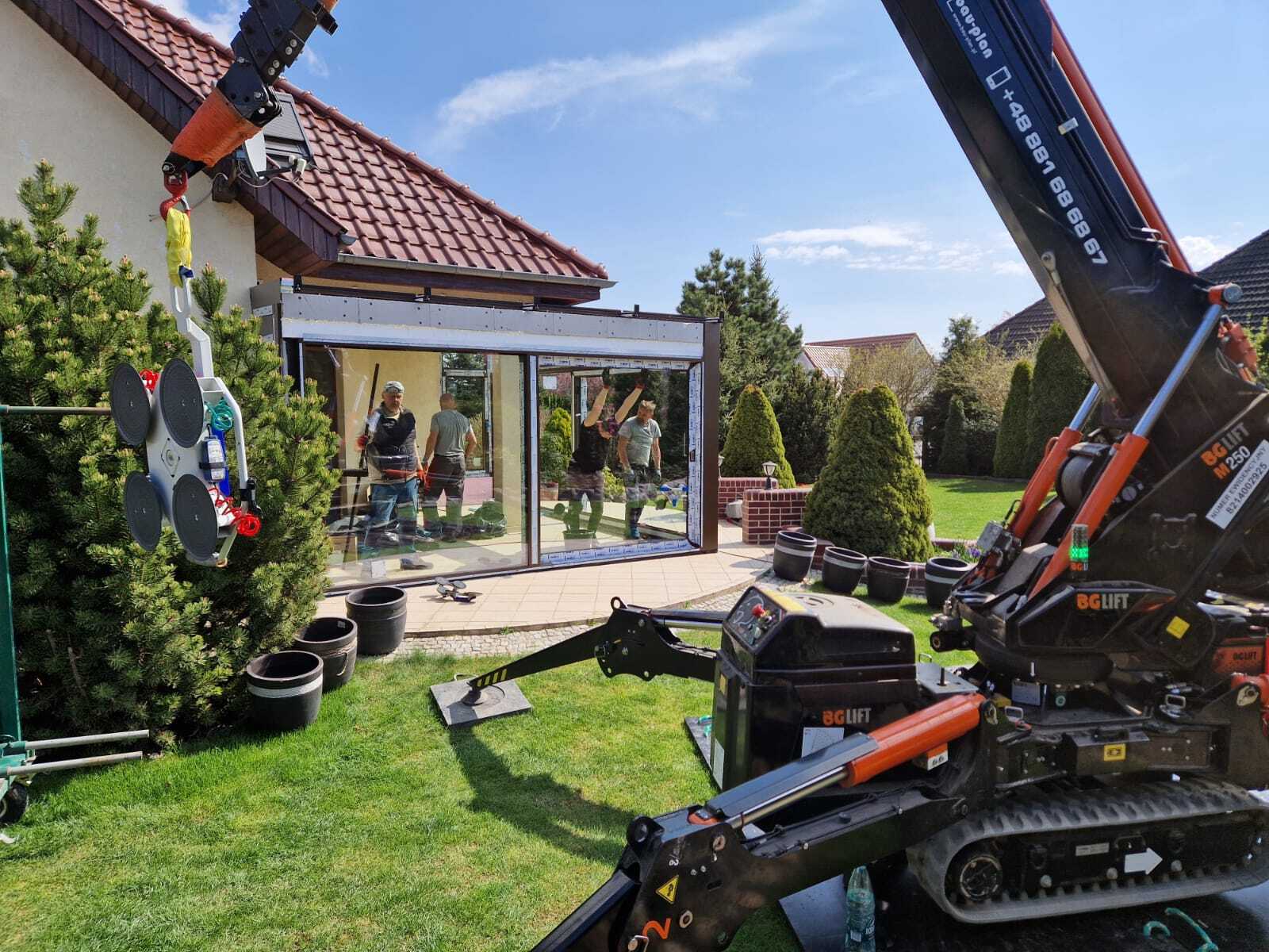 Die Verglasung des Wintergartens mithilfe Minikran BG Lift M250 in Landsberg an der Warthe.