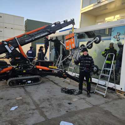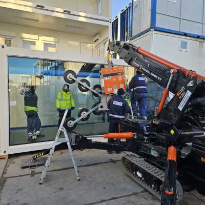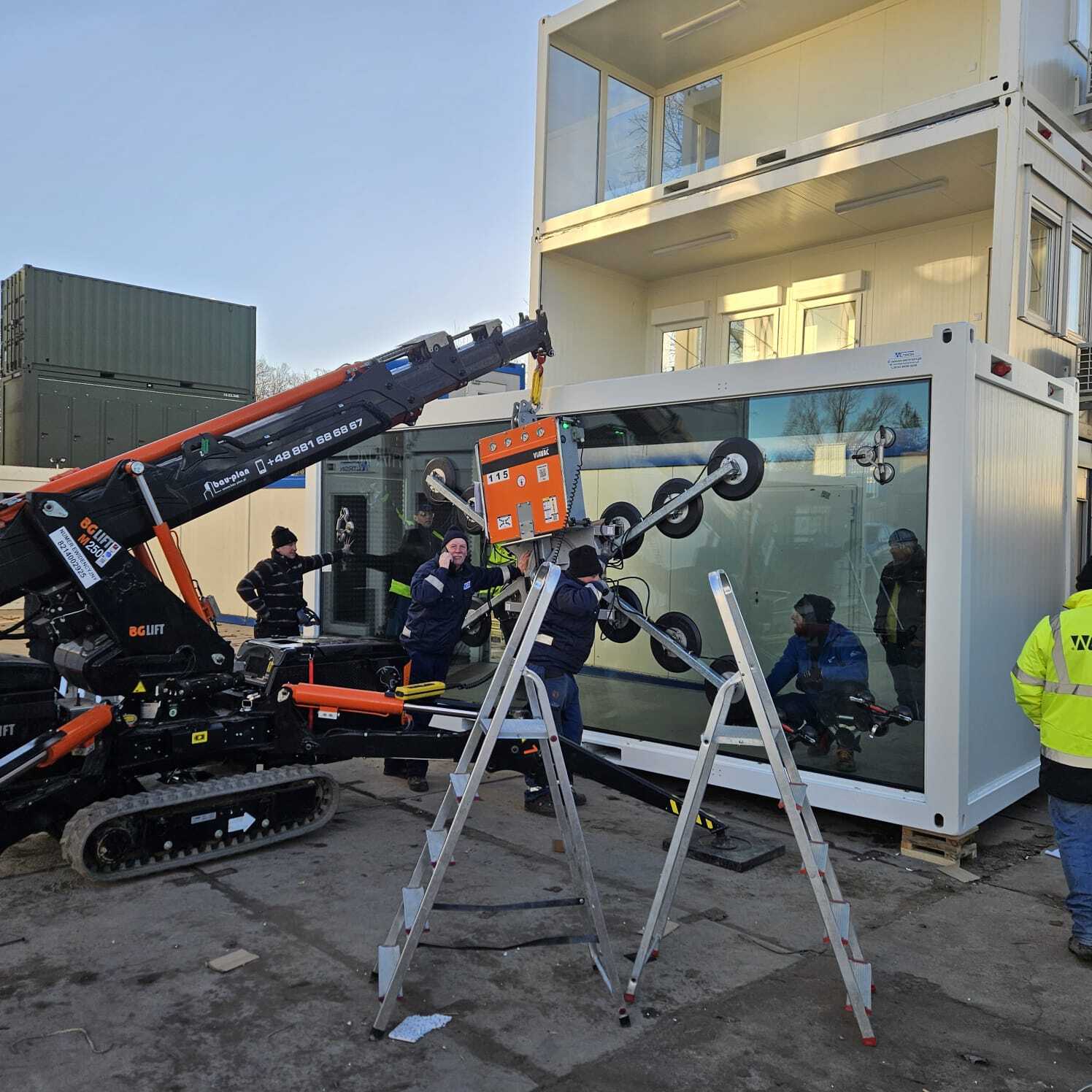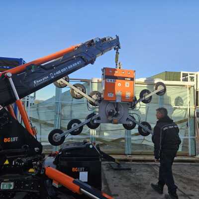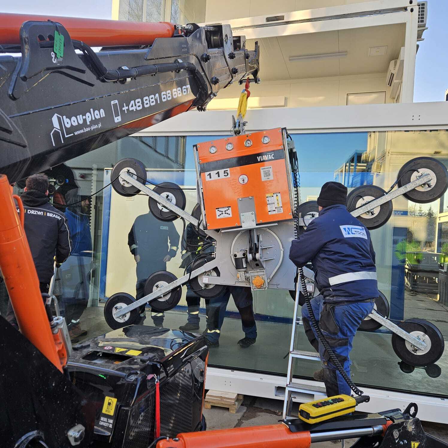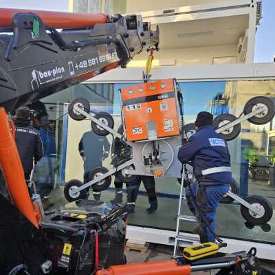 Fachgerechte Montage einer Schallschutzscheibe mit den beeindruckenden Maßen 2395 mm x 5740 mm und einem Gewicht von 1106 kg.